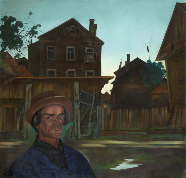 Художник написал свой автопортрет на фоне старых зданий Нарвской заставы, определив таким образом собственное место в ленинградском искусстве в качестве певца городских окраин. Ночное освещение выбрано им как способ обобщения цветовых отношений и пластических объемов. Лицо, переданное несколькими широкими плоскостями, напоминая лица средневековых воинов, викингов, придает образу монументальность и значительность. Анна Антонова // Санкт-Петербург: Портрет города и горожан. СПб, 2003. С. 204.