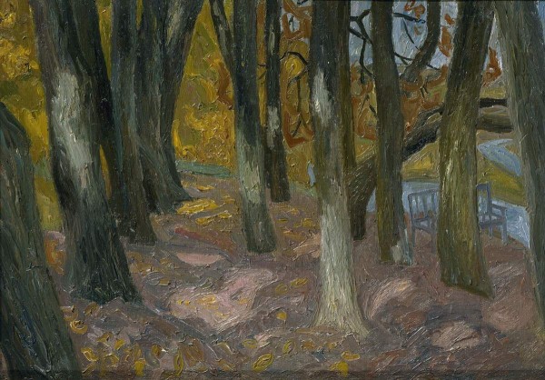 В. Е. Попков посетил заповедник «Пушкинские горы» в октябре 1973 года. Здесь он создал серию из десяти пейзажных этюдов, итогом которой стала картина «Осенние дожди (Пушкин)» (1874, ГТГ). К этому пушкинскому циклу относится и работа «Тригорское. Скамья Онегина». Художник изобразил одно из памятных мест усадьбы Тригорское – площадку, с которой открывается вид на долину реки Сороть. Владельцы усадьбы, семья Осиповых-Вульф, другом и частым гостем которой был Пушкин, связывала это место со сценой свидания Онегина с Татьяной Лариной в третьей главе романа «Евгений Онегин». В семейном предании скамейка, стоящая в этом живописном уголке парка Тригорского, получила название «Скамья Онегина». Л. В. Шакирова // «Он победил и время и пространство...». К 225-летию со дня рождения А. С. Пушкина. СПб, 2024. С. 96.