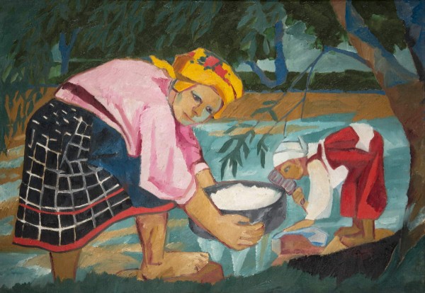 Образы крестьянок в картине Гончаровой «Бабы» исполнены тяжелой, первобытной силы. Если в ларионовских «жанрах» всегда ощутима ирония или самоирония, то работы Гончаровой впечатляют, прежде всего, неподдельной глубиной переживания и истовой страстностью. Она «очищает» сюжет от бытовых деталей, усиливает наглядность жеста, который приобретает символическую, даже сакральную завершенность. Фигуры как бы замирают в заранее определенном им действии – и это действие преобразуется в некий вневременный обряд. «Бабы» Гончаровой напоминают не столько тульских крестьянок, сколько степных кочевниц с их резкой и вместе с тем выразительной «звериной» пластикой.