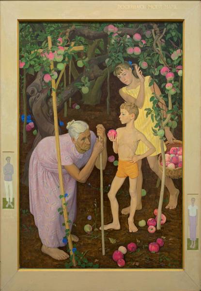 Как и многие картины Жилинского — это произведение,  посвященное матери художника, автобиографично. В нем автор изобразил два поколения семьи Жилинских. Рядом с матерью Анастасией Федоровной (1898–1987), образ которой запечатлен на переднем плане картины, под яблоней стоят двое детей — ее внуки. Созданная Дмитрием Жилинским рама, использованная художником как дополнительное поле изображения, вносит в произведение трагические ноты. Слева на раме художник пишет фигуру отца, Дмитрия Константиновича (1900–1939), репрессированного, расстрелянного (1939) и посмертно реабилитированного, справа — образ брата, погибшего на фронте (1944). В верхней части рамы надпись: «Посвящаю моей маме». Таким образом, рама становится не только дополнением, завершением живописного полотна, но и его неотъемлемой частью.