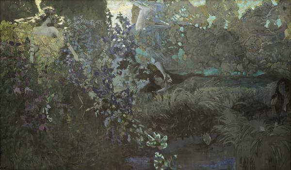 Показать полный текстВ панно «Утро», «Полдень», «Вечер» отразились устремления Врубеля к искусству «большого стиля», интерес к решению проблем синтеза. Впервые в его полотнах доминировал пейзаж. Это связано с особенностями интерьера. Картина «Утро» принадлежит Русскому музею. Решенная в гамме «болотной зелени», любимой мастерами модерна, полная таинственности и неясных намеков, уподоблений, она — характерный пример декоративной системы «нового стиля» и символизма как философии искусства. Автор учел ее место в зале, особенности пространства, пронизанного витальностью. Холст «аккумулировал» множество проявлений жизненных сил, «материализовав» их в виде четырех стихий — в девственной чаще леса изображены фигуры, символизирующие пробуждающуюся землю, прячущуюся в зарослях цветов и трав воду, луч солнца и рассеивающийся ночной туман. Как и формы, одухотворены их очертания, складывающиеся в магические орнаменты. Картина экспонировалась на выставке русских и финляндских художников, где в первый день была приобретена княгиней М. К. Тенишевой. / Владимир Круглов. Наследие Михаила Врубеля в Русском музее // Михаил Врубель. СПб, 2006. С. 18.