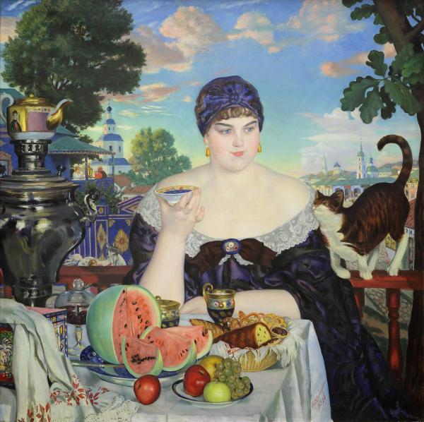 Трудно представить, что душевно и колористически щедрое, светоносное искусство Кустодиева сохранило свои удивительные качества даже в ту пору, когда болезнь лишила его возможности двигаться. Как справедливо отмечали исследователи, а прежде всего сам художник, у него была «чудесная страна воспоминаний». То были сюжеты и люди уже ушедшей, но не утратившей свой терпкий аромат жизни. «Купчиха за чаем» — замечательный и характерный пример такого образного воспоминания о сочных пышных красавицах, о приближающихся лазоревых вечерах, о монументально торжественных чаепитиях, о неторопливой и, кажется, неизбывной жизни с ее мерным укладом. В роскошном натюрморте трапезы, сверкающем величии самовара, в вывесочной красочной яркости сахарного арбуза, мраморной белизне плеч купчихи, в живописной красоте и выразительности каждой детали господствует звучное многоцветье. Русский музей. От иконы до современности. СПб. 2015. С. 304.