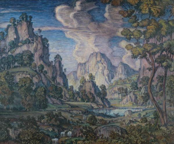 Большой массив произведений <Богаевского> составили работы, посвященные античному Крыму, словно увиденному сквозь призму пышных полотен и гобеленов XVII столетия, — картины «Утро» (1910, ГТГ) и «Классический пейзаж» (Ж-2338), акварели «Пейзаж» (Р-5168), «Пейзаж» (Р-13507), «Утро» (Р-5832), «Фантастический пейзаж с солнцем» (Р-57562). Они представляют собой остро индивидуальный «симбиоз» реальности, интуитивистских прозрений картин далекого прошлого и сладостно-грустного поэтического вымысла. Владимир Круглов. Константину Богаевскому 150 лет // Константин Богаевский. СПб. 2023. С. 9.