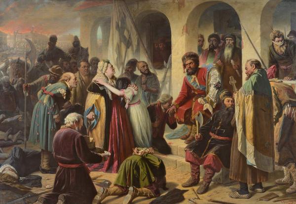 The death of Peter III gave rise to a large number of legends and led to the appearance of pretenders. The most famous of these was Emelyan Pugachev (1740/1742-1775), who was the leader in the peasant rebellion of 1773-1775. Pugachev’s origins lay in the Don Cossacks; he took part in the wars against Prussia and Turkey and was given a junior officer’s rank for his bravery in battle. He acted several times as petitioner on behalf of Cossacks and peasants. He was thrown into prison for this, but escaped in 1773 and fled to the Urals. In September that year he announced himself to the Cossacks as Emperor Peter III, and after assembling an army of more than 20,000 men he began a merciless war against the gentry. Pugachev displayed very fine military and organisational abilities, but in September 1774 his accomplices handed him over in exchange for a promise of clemency from the government, and he was executed on Bolotnaya Square in Moscow on 10 January 1775. Vasily Perov has treated the ominously gloomy scene of Pugachev sitting in judgement as a tragedy for the people, where each person is the bearer of his own truth. Pugachev appears in the picture as a fierce tyrant whom the other characters either oppose or obey. Their images recall characters from Pushkin’s famous story The Captain’s Daughter: the elderly woman embracing her weeping daughter reminds us of the brave Vasilisa Mironova, the wife of the commander of the Belgorod Fortress, and the young officer kissing Pugachev’s hand could be the traitor Alexei Shvabrin.