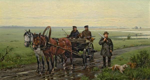 Картина «Охотничья сцена» – одно из ранних произведений Н. С. Самокиша, прославившегося в дальнейшем своими батальными работами. Известно, что художник во время каникул в Академии художеств нанимался учителем рисования и уезжал в дальние имения, где писал этюды лошадей, зарисовывал сцены азартной охоты, делал наброски охотничьих собак. Н. С. Самокиш считал лошадь "благородным и красивым созданием" и старался изображать не только ее внешнюю красоту, но и передать нрав животного. Особенное внимание он уделял изображению тела животного во время движения. Он говорил: "Даже кляча на скаку красива и живописна. Я не любитель парадов и ничего художественно-красивого не нахожу в правильно построенных колоннах…".