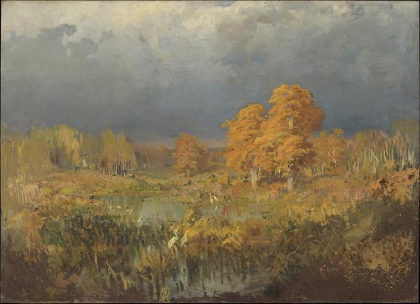 Незадолго до своей кончины писал И. Крамскому: «О, болото, болото! Как болезненно сжимается сердце от тяжкого предчувствия! Ну, неужели не удастся мне опять дышать этим привольем, этой живительной силой просыпающегося над дымящейся водой утра?». Изобразив осенние деревья на фоне темно-сизой тучи, художник заставил с необычайной силой гореть медно-золотистые кроны пышнолиственных дубов, поддержав этот звенящий цветовой акцент сложным аккомпанементом оттенков желтого и красного в березовых и осиновых рощах дальнего плана. Воспоминания о прекрасном осеннем убранстве русских лесов Васильев сочетал с наблюдениями, сделанными им в крымских горах, расцвеченных по осени необычайно яркими и свежими цветными пятнами. Застывшие в предвечерней тишине осенние дубы как бы светятся в теплых лучах клонящегося к вечеру солнца. Недвижные, какие-то загадочные силуэты болотных птиц среди зеленой и ржаво-красной растительности вносят в общее настроение ноту таинственности, задумчивости и грусти, очень типичную для последних картин Васильева. Свойственная ему романтичность образного строя получила здесь преимущественно элегическое звучание. Живопись картины свободна и выразительна в каждом мазке, будучи предельно точной и продуманной в многочисленных нюансах. О своих впечатлениях о картине И. Крамской писал автору: «Настоящая картина — ни на что уже не похожа, никому не подражает, не имеет ни малейшего, даже отдаленного сходства ни с одним художником, ни с какой школой, это что-то до такой степени самобытное и изолированное от всяких влияний, стоящее вне всего теперешнего движения искусства, что я могу сказать только одно: это еще... не вполне хорошо, ... но это — гениально».