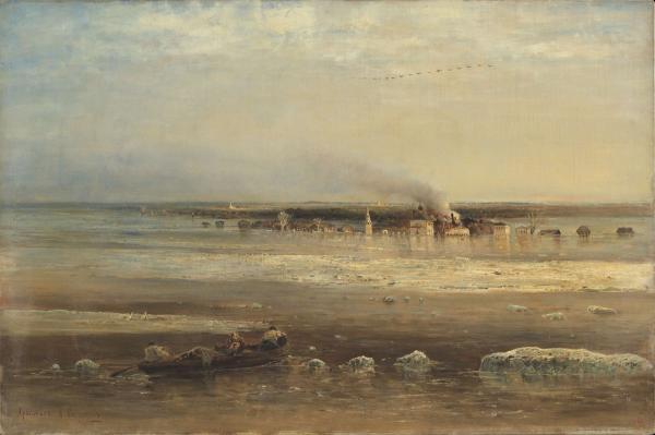 Семидесятые годы стали временем наивысшего расцвета творчества Саврасова. Этому в значительной степени способствовало его знакомство с Волгой, с ее огромными просторами, с могучим течением вод, с многообразием берегов, с жизнью населяющих прибрежные города и села людей. Волга вдохновила художника на создание многих пейзажей, полных светлых чувств, а иногда и щемящей грусти. Река способствовала формированию у него национального образа природы, углубляла ощущение присущей ей мягкой лирики, столь близкой свойственному Саврасову задушевному переживанию природы. В ту же весеннюю пору, когда была создана картина «Грачи прилетели» (ГТГ), исполнено и другое высокохудожественное произведение «Разлив Волги под Ярославлем» (1871). Несмотря на известную жанровую повествовательность, главное в нем не противостояние человека и стихии, а неоглядная ширь, захватывающий простор разлившейся реки, освобождающейся от сковывающих ее льдов и торжественно раскинувшейся под голубовато-серым небом, на котором виднеется стая перелетных птиц. В основе колористической гаммы — тонкие градации коричневатых и разбеленных голубоватых тонов, подобно тому, что видно в целом ряде работ художника. Вдохновенно исполненный пейзаж дышит правдой и жизнью. И. Н. Шувалова. Вступительная статья к альбому // Алексей Кондратьевич Саврасов. СПб, 2006. С. 10.