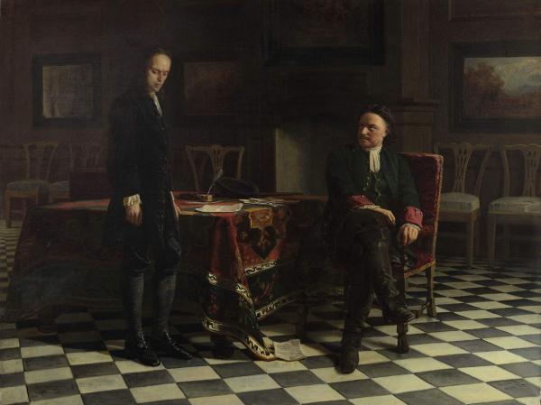 Чтобы правдиво воссоздать этот исторический эпизод, ставший основой сюжета картины, художник тщательно изучал документы и портреты Петра I и царевича, костюмы начала XVIII века, а также точно воспроизвел кабинет императора во дворце Монплезир в Петергофе. Произведение представляет собой повторение одноименной картины 1871 года, находящейся в Третьяковской галерее.