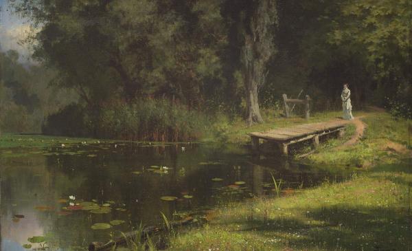В картине «Заросший пруд» художник поэтически трактует уголок старого усадебного парка, одинокая фигура женщины в его глубине (изображена сестра художника Вера Дмитриевна Хрущева; 1844–1881) усиливает романтическое настроение. Это произведение — один из лучших пейзажей в творчестве Поленова на рубеже 1870–1880-х годов. Русский музей. От иконы до современности. СПб. 2015. С. 213.
