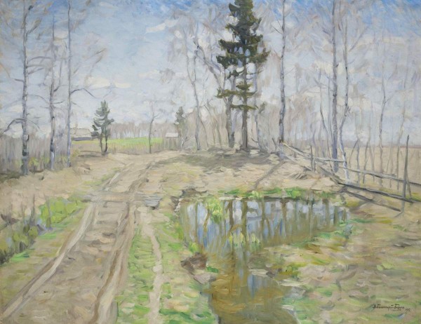 В творчестве мастера получили развитие традиции русского лирического пейзажа. Художник уступал ряду своих современников в значительности художественных замыслов, но в небольшом кругу любимых сюжетов достигал высоких результатов. Интересы живописца отданы изображению природы российской деревни, а главным источником поэтических переживаний являются непосредственные впечатления от общения с натурой. В картине "Изумруд весны" художник предстает как яркий приверженец так называемого пейзажа настроения. Весна, деревенская околица, дорога, блестящие лужицы воды, нежная зеленеющая трава... Светлое радостное состояние природы в один из ее переходных периодов – весна во всей своей сути. Своеобразен колористический строй полотна, чрезвычайно характерный для художника, любившего писать в зеленовато-голубых, сероватых, сиреневых полутонах.