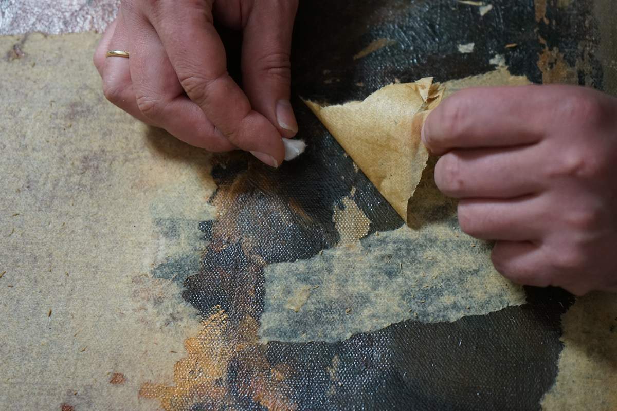 Для удаления толстой заклеечной бумаги была разработана методика постепенного её утоньшения путем "скатывания" с использованием раствора целлюлозы. При этом оставлялся тонкий пластичный слой бумаги. Местами бумага удалялась полностью, местами, где просматривались расслоения или вздутия, проводилось укрепление прямо поверх оставленного тонкого слоя с применением различных методов: распаривание, глубинная пропитка, иньектирование. После удаления старой плотной бумаги проведено двукратное глубинное укрепление красочного слоя. С тыльной стороны удалены старые пластыри и чинки, заделаны мелкие прорывы, подведены реставрационные кромки и картина натянута на новый подрамник.