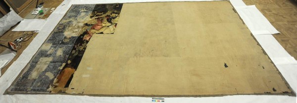 Группа реставраторов Русского музея в составе Марата Дашкина (руководитель), Наталии Романовой и Марии Солдатенковой, разработав план реставрационных мероприятий, произвела уникальную по сложности и масштабам работу: послойное удаление бумаги и остатков побуревшего клея, полное укрепление красочного слоя с глубинной пропиткой, заделку прорывов холста и подведение к нему дублировочных кромок, натяжку полотна на новый подрамник с последующим восполнением утраченных участков красочной поверхности.