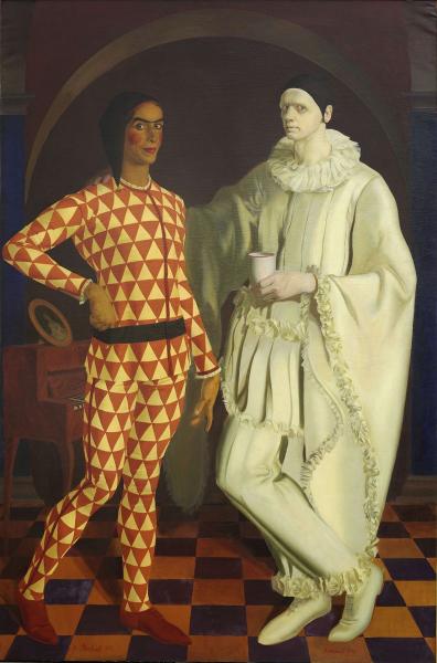 Художники изображены в костюмах Арлекина (Яковлев) и Пьеро (Шухаев), героев пантомимы А. Шницлера «Шарф Коломбины», поставленной в 1911 году В. Э. Мейерхольдом в театре «Дом интермедий» в Петербурге. Некогда случайно попав на этот спектакль, художники стали постоянными его зрителями, познакомились с актерами, режиссером и однажды были приглашены на исполнение главных ролей. Мысль написать совместный автопортрет, изобразив себя в роли героев комедии, пришла в Италии, где Яковлев и Шухаев находились после окончания Академии. Картина, исполненная двумя мастерами, столь цельна по манере письма, что воспринимается как произведение, созданное одной рукой. В нем четко выразилось творческое кредо авторов. Последовательные ученики Д. Н. Кардовского, они обратились к традициям русского академического искусства XVIII и первой половины XIX века. Передать форму, ее объем, плотность, цвет вне зависимости от мимолетного состояния было задачей художников. Этому в портрете подчинено все: академически четкий, строгий рисунок, светотеневая моделировка формы, локальный цвет, бесфактурная кладка мазка. Вместе с тем в произведении сказалась особая экспрессивность решения образов, характерная для искусства начала ХХ века. (В. Кн.). Русский портрет. ХХ век. СПб, 2001. С. 113.