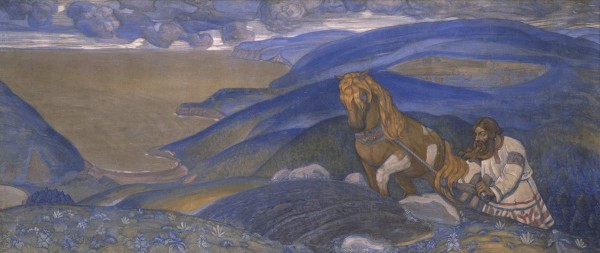In 1909-1910 Roerich performed the series of panels "Bogatyr frieze" for the mansion of Philadelph (Philipp) Bazhanov, the prominent industrialist and honorable citizen of Saint- Petersburg. The house was built by the architect Pavel Aleshin in 1907-1908 in the Art Nouveau style. Unique design was characteristic of every interior he created, but the theme of heroic Ancient Rus was the dominant one. The living room was decorated with majolica fireplace "Volga and Mikula", made according to the sketch of Mikhail Vrubel. The Roerich's panel was located in the dining room. The series consisted of eight narratives (“Sadko”, “Knight”,”Boyan (Bard)”, “Ilya Muromets”, “Mikula Selyaninovich”, “Hill Fort”, “Volga Svyatoslavovich”, “Nightingale the Robber”) and eleven decorative compositions. The creation of the monumental "Bogatyr frieze" became the culmination of Roerich’s appeal to the epic topic in his work.