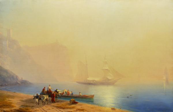 Уже в ранние годы художник создал особый тип полотен, романтизированных «в восточном вкусе», имевших успех у русских и зарубежных зрителей. Любимые им мотивы моря, освещенного то палящими, то нежными лучами солнца, он обогатил изображением древностей южного берега Крыма, где жил и где находил вдохновение в течение всей долгой жизни. В данном случае это — остатки старинной генуэзской крепости на вершине скал Судака, еще окутанных утренним туманом. Лирический романтизм целого усиливает сцена на берегу с фигурами мирных обитателей здешних мест — татар или турок в их экзотических для европейского глаза одеждах.