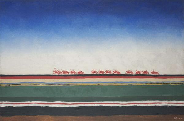 Гонимые неведомой силой, затерянные в вечном пространстве, мчатся революционные всадники под красными стягами по земному шару. Тонкие красные силуэты словно истаивают среди супрематических полос чистых цветов. Бесцелен и бессмыслен их яростный бег, ибо бесконечна дорога, безразличны земля и небо к людской суете и никогда не было и не будет во Вселенной земли обетованной.