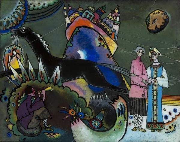 Female Rider in Hills, Female Rider and Blue Lions, White Cloud and With Fruits are painted in oil on glass ‒ a technique dating back to the traditions of Old German folk art, which Wassily Kandinsky studied in Murnau in the late 1900s and returned to at the end of the 1910s. The most remarkable features of these works are its naive narrativeness, deliberate rejection of real scales and perspective, bright and flat painting of the figures and objects, equality between the major and minor details and the strongly expressed folkloric basis.