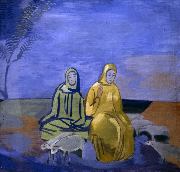 В холсте «Вечер в степи» также отсутствует событие и господствует вечная статика. Изображена беспредельная оранжево-зеленая гладь степи и единственное растение — «дерево пустыни», чьи гибкие линии вторят очертаниям фигур двух женщин в окружении барашков. Как некогда Борисов-Мусатов, Кузнецов синтезирует жизненные наблюдения в идеальный и отвлеченный мир мечты, автономный от будничного течения жизни и ее противоречий. Вневременный, он подчинен законам высшей гармонии, отразившимся в совершенстве пронизанной мягким ритмом композиции, вписанной в почти квадратный формат полотна, в выразительном колористическом решении. Полон достоинства, величав облик погруженных в медитацию женщин. Наполняющие картину голубые, лиловые, розовые, желтые тона неба и земли вызывают почти музыкальные ощущения тихой меланхолии, сожаления о несбыточном. Картина написана темперой. Ее матовая, мерцающая поверхность гармонирует с изысканными сочетаниями дополнительных голубовато-зеленых и желто-розовых тонов, с медлительной плавностью ритмов очертаний холмов, людей и животных. Владимир Круглов. Павлу Кузнецову 145 лет // Павел Варфоломеевич Кузнецов. СПб, 2023. С. 12-14.
