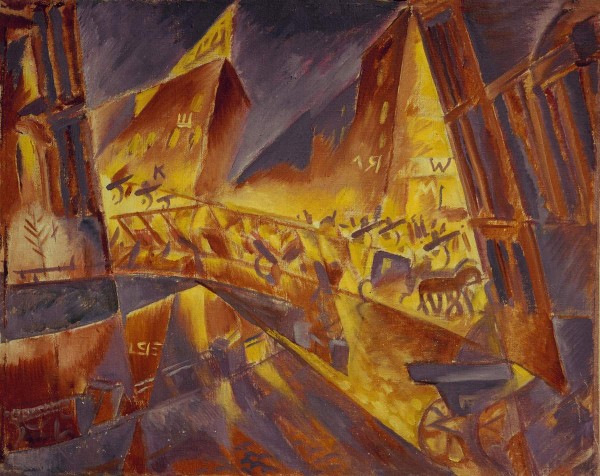 Изображая вполне узнаваемое место в городе – угол Мойки и Невского проспекта, – художник трансформирует реальность в духе футуризма, именно в середине 1910-х годов набиравшего энергию и размах в России. И по мотиву, и по своим пластическим основам картина отражает главные принципы футуризма: выявление пространственных силовых линий, по которым строится вся композиция, ее фрагментарность, нарочитая „сдвинутость", придающая ей максимальную динамику, наконец, введение в композицию фрагментов надписей, что должно, по замыслу художника, передавать ощущение городской суеты и уличного шума. Е. Б. // Санкт-Петербург: Портрет города и горожан. СПб, 2003. С. 98.