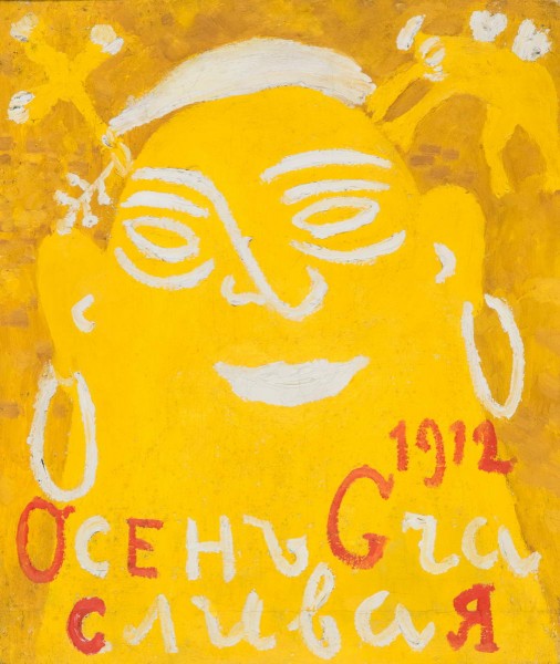 In 1912, in parallel to his work on his Rayonist compositions, Mikhail Larionov painted several pictures in the spirit of «Infantile Primitivism». Among them and affiliated to the Seasons cycle is the canvas «Ha[p]py Autumn». The artist was captivated by children’s drawings and collected them over the entire course of his lifetime. A spontaneous naivety, borrowed by the artist from these same drawings, is reflected here in the expressive «simplicity» of the colour and the «clumsy» ungrammatical inscriptions. At the same time, the natural drawing of the lips, earrings and letters anticipates Larionov’s later work on Futurist books, where he achieved a similar union of word and image. Russian Museum: From Icons to the Modern Times. Palace Editions, St Petersburg, 2015. P. 301.
