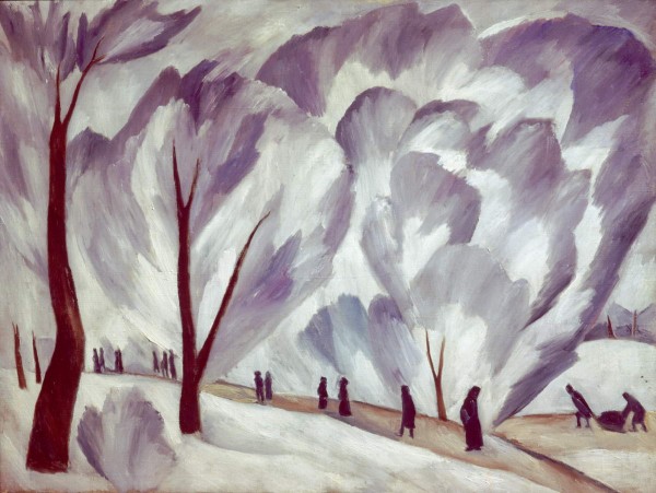 В 1910–1911 годах Гончарова пишет ряд картин на зимние сюжеты, в которых ее привлекает задача „черно-белой“ декоративности. Несколькими годами раньше она иллюстрировала сборник стихов Тихона Чурилина „Весна после смерти“ , где в стихотворении “Иней”— „ритм жизни и смерти“ обозначался как „черное на белом“. На картине заиндевевшие кроны деревьев, данные обобщенными цветовыми пятнами с помощью характерных веерообразных решительных мазков, заполняют почти все пространство холста и воспринимаются как застылое “колючее“ царство, “саван“. Его контрастно дробит черный ритм силуэтов стволов и маленьких людских фигурок.