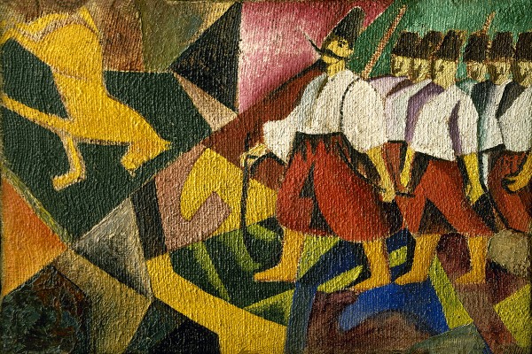 Работа «Малороссы» была создана в 1912 году. Само это слово – Малороссы – обозначает жителей Украины, которая входила тогда в состав Российской империи. В картине чувствуется кубистическое влияние – на множестве разбитых плоскостей видны силуэты лошадей. Поверх этого кубистического слоя показана процессия малороссов в национальных костюмах. Фигуры нарочито стилизованы под изобразительность народных промыслов.