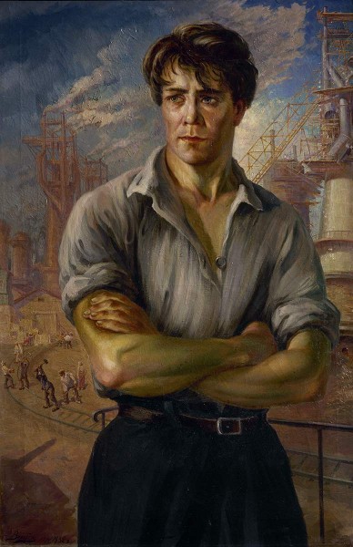 Художник не столько стремится запечатлеть в портрете черты внешности и характера конкретного лица, сколько синтезирует на полотне безупречный образец нового советского человека. Труд, приобретающий в СССР значение героического подвига, показан здесь прежде всего как состояние непрерывной готовности к штурму новых производственных задач, ясно выраженное позой и выражением лица юноши. Адекватным фоном монументальной фигуре служит показанный с птичьего полета индустриальный пейзаж, говорящий о гигантских масштабах социалистического строительства, в котором принимает участие изображенный персонаж. Для счастья народа. Каталог выставки Русского музея в Малаге. 2018. С. 37.