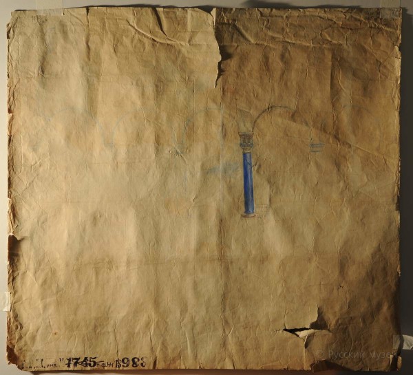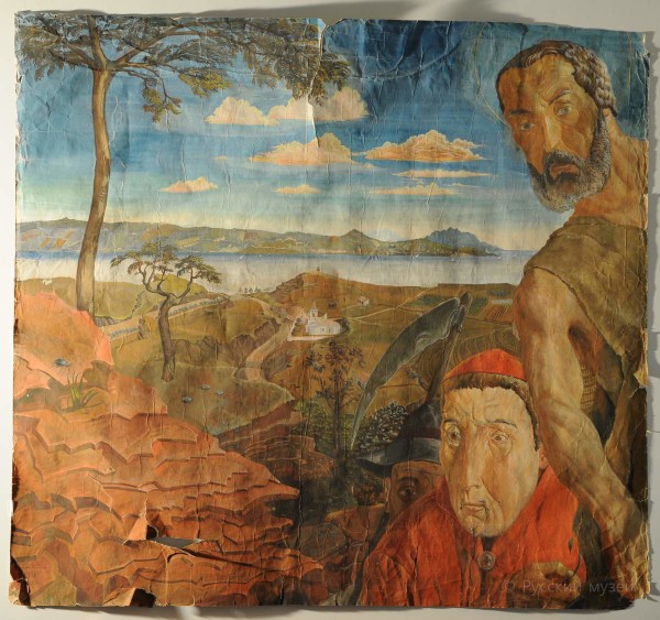 При поступлении в реставрацию картина имела значительные механические повреждения в виде жестких, в основном вертикальных, изломов бумажной основы (происшедших, скорее всего, от сворачивания картины в рулон). Часть изломов с лицевой стороны имела обветшавшие края с утратами красочного слоя. Края картины также сильно обветшали, имели многочисленные мелкие разрывы и утраты бумаги. Правые углы основы были утрачены. От центра верхнего края вниз – фигурный разрыв основы 20 см; в левой нижней четверти – фигурный прорыв основы общей длиной 30 см. Наблюдались значительная общая коробленность сильно окислившейся бумажной основы.