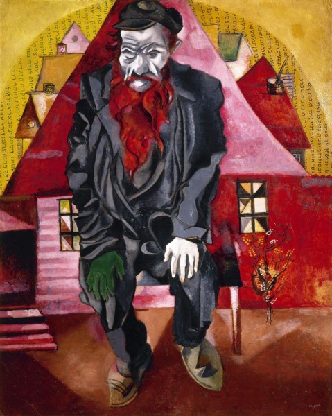 После возвращения в Витебск из Парижа, в 1914–1915 годах, Шагал пишет серию картин, которую затем экспонирует в Петербурге. В каталоге выставки значатся такие работы, как «Еврей зеленый», «Еврей с мешком», «Еврей со скрипкой». «Красный еврей» (на выставке это произведение фигурировало, очевидно, под названием «Еврей с буквами») может быть, безусловно, причислен к наиболее драматическим полотнам этого цикла. И колористическая тональность, заявленная в позднейшем названии картины, играет в этом не последнюю роль. Именно цвет преображает тип нищего старика-еврея в образ поистине трагический и наделяет его эпической силой. Русский музей. От иконы до современности. СПб. 2015. С. 276.