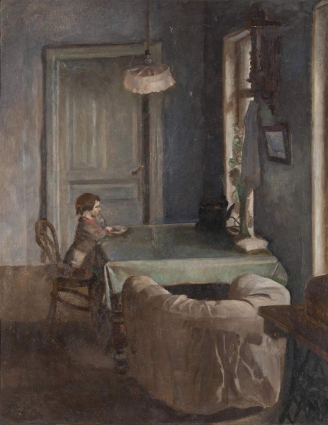 Необъяснимая тревога появлялась в художественных образах 1920–1930-х годов, где был представлен человек, оставшийся наедине с собой. Так, <...> композиционная асимметрия подчеркивала «неуют» домашней обстановки в картине «Женщина за столом» (1929) Александра Русакова, выбранный ракурс делал несоразмерно пугающим пространство интерьера в живописном полотне «Комната» (1934) Леонида Хорошкевича. В подобных «камерных» сценах художникам не удавалось абстрагироваться от реалий беспокойного времени. Кривонденченков С.В. Ностальгия по настоящему // Дом и семья в русском искусстве XIX-XX веков. СПб, 2022. С. 9.