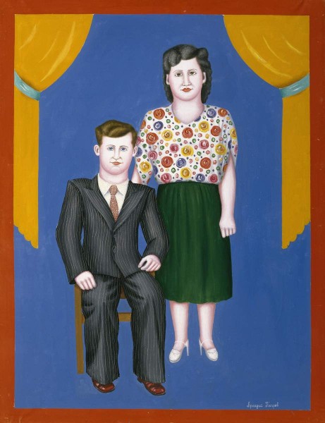 Современные портретисты часто прибегают к использованию приемов примитива с целью привнесения в изображение элемента иронии. Подсмеиваясь над собой, Аркадий Петров изобразил себя и жену в виде самодовольных принарядившихся провинциалов. // Анна Антонова. Русский портрет. ХХ век: СПб, 2001. С. 327.