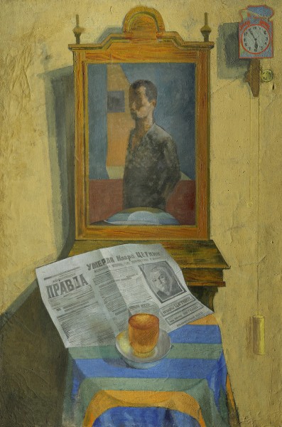 «На смерть Клары Цеткин» – картина-реквием. В ней отчасти повторен прием, найденный в раннем натюрморте Малагиса, посвященном смерти В.И. Ленина – мотив натюрморта с газетой в траурной рамке. Однако теперь художник ставит более сложные живописно-пластические задачи, ему удается найти нетривиальное многоплановое композиционное построение, включающее натюрморт на первом плане, зеркало как границу между реальным и «зазеркальным» миром – на втором и автопортрет, видимый в зеркале и существующий на третьем плане.