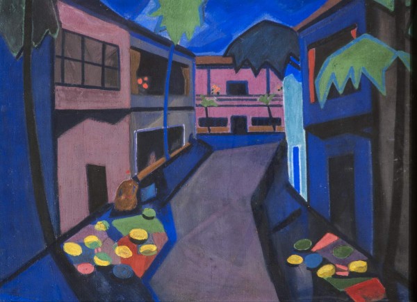 Необычный мотив «Пейзажа», изображающего улочку безлюдного восточного города, полупризрачного и загадочного, словно навеян фантазиями «Тысячи и одной ночи». Особую таинственность придает пейзажу его «минорная тональность», свойственная многим картинам Иосифа Школьника, сквозящая в напряженном сине-лиловом колорите, в тревожных контрастных вкраплениях красного и черного, желтого и голубого. В декоративности картины ощутим и отголосок народного искусства, которым Школьник был увлечен, как и многие другие художники его круга, и своеобразный ориентализм, входивший важной составной частью в русское искусство начала 1910-х годов.