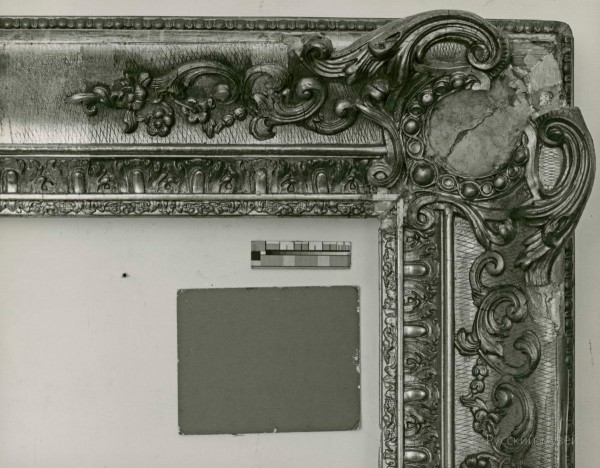 - Wood, мастика, gesso, позолота, carving, лепка, комбинированное золочение, тиснение по левкасу. 112,5 х 87 см; размер окна – 87 х 62 см