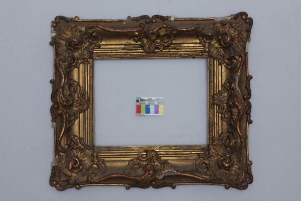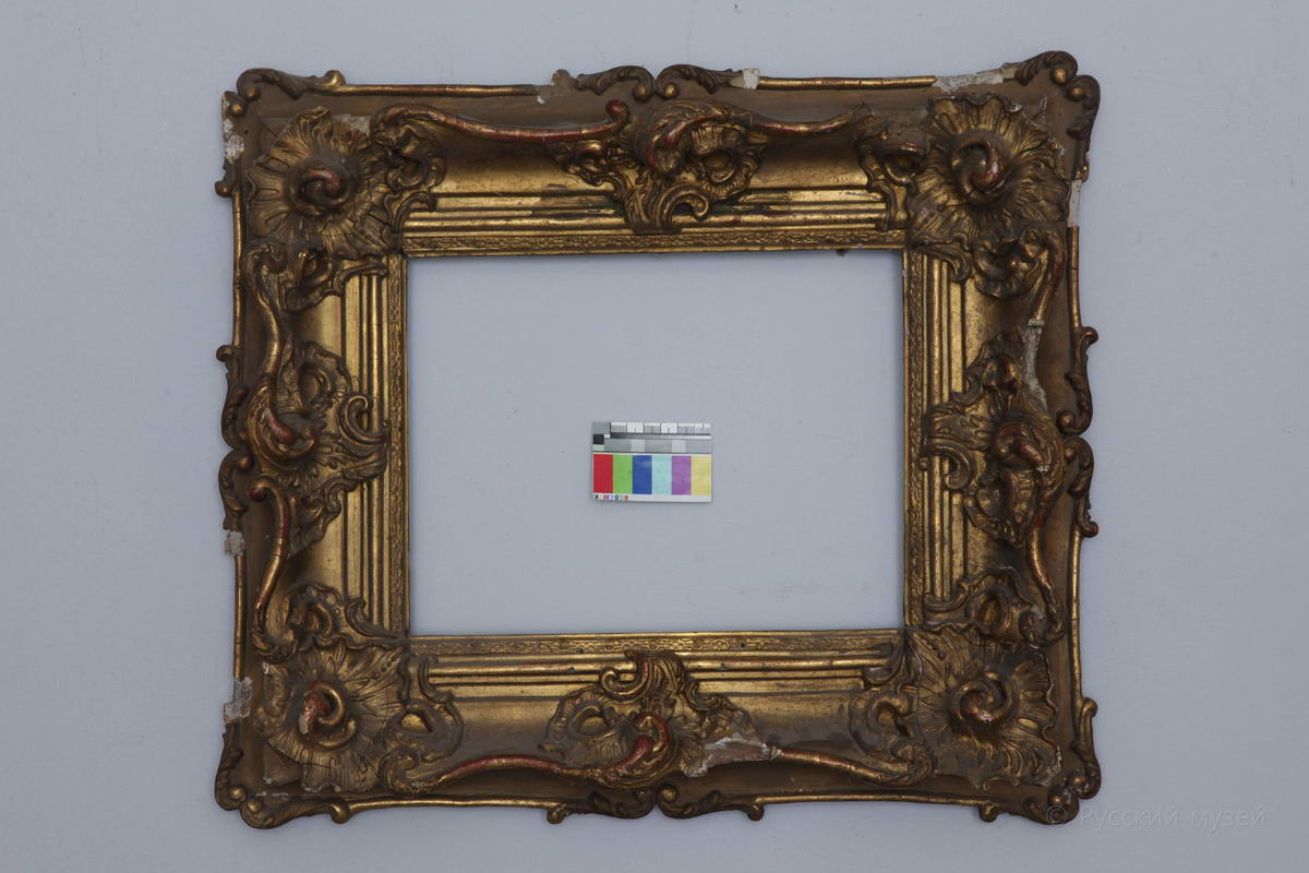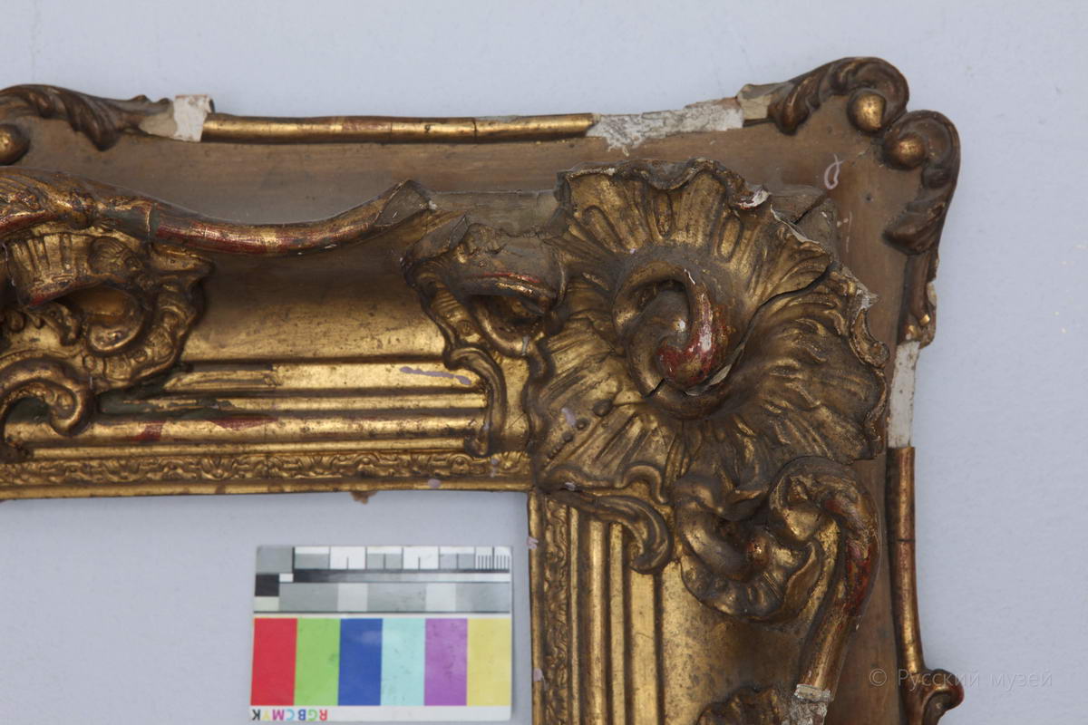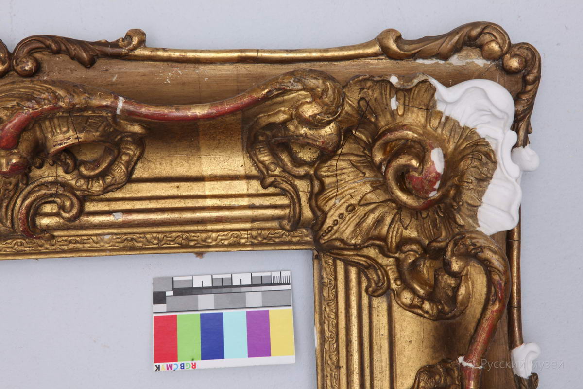 Силуэтная рама, выполненная в рокайльно-барочных формах. Поступила в реставрацию со значительными утратами лепного декора, сквозными разошедшимися трещинами орнамента со смещением краев. Имелись многочисленные трещины и утраты грунта, обширные потертости позолоты по горельефу орнамента. Поверхность рамы была сильно загрязнена плотным слоем спрессовавшейся пыли.