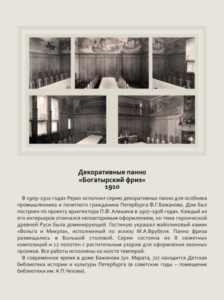 В 1909–1910 годах Рерих исполнил серию декоративных панно для особняка промышленника и почетного гражданина Петербурга Ф.Г.Бажанова. Дом был построен по проекту архитектора П.Ф. Алешина в 1907–1908 годах. Каждый из его интерьеров отличался неповторимым оформлением, но тема героической древней Руси была доминирующей. Гостиную украшал майоликовый камин «Вольга и Микула», исполненный по эскизу М.А.Врубеля.