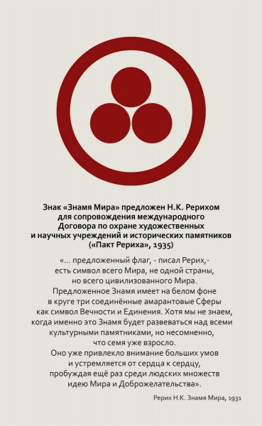 Знак «Знамя Мира» предложен Н.К. Рерихом для сопровождения международного Договора по охране художественных и научных учреждений и исторических памятников («Пакт Рериха», 1935)
