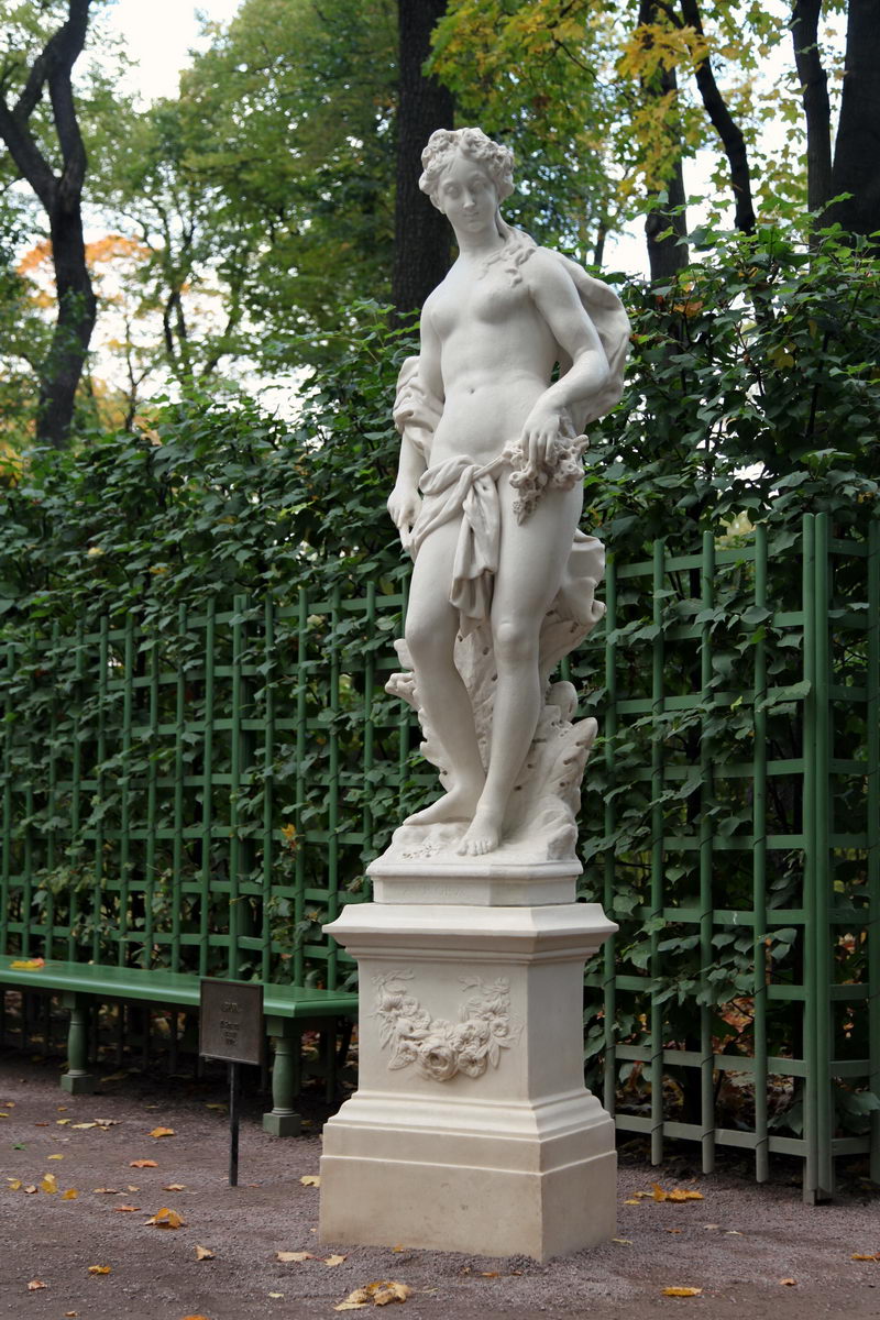 Серия скульптур "Круговорот суток" выполнена талантливым скульптором Джованни Боннаца. Ночь и утренняя заря, полдень и закат, сменяя друг друга, отмечают на земле извечный круговорот суток. Лучезарная "Аврора", сияющий "Полдень", сумрачный "Закат", мудрая задумчивая "Ночь" аллегорически изображали четыре времени суток и предназначались для установки на крыше Грота. Сохранился альбом рисунков, своего рода сопроводительный документ, в котором неизвестный итальянский художник запечатлел статуи и бюсты, заказанные Петром I в Италии. В альбоме указаны названия скульптур и имена создавших их мастеров. На рисунках из этого альбома скульптуры, изображающие времена суток, показаны крылатыми, но их крылья не сохранились.