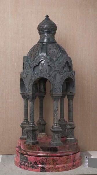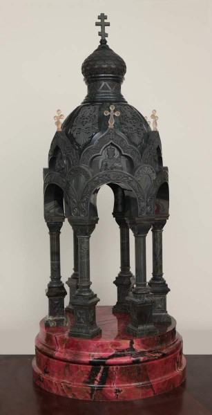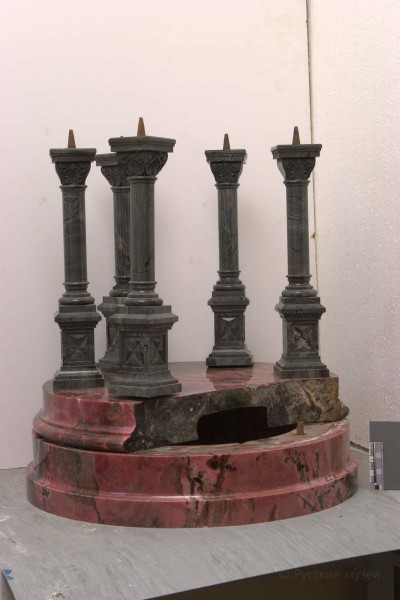 Экспонат поступил в мастерскую с многочисленными утратами и повреждениями. Были утрачены кресты на шести кокошниках и крест на куполе, имелись значительные сколы на кокошниках, арках, колоннах и пьедестале. Наблюдались многочисленные трещины природного происхождения на верхней части постамента, значительные трещины на куполе, на навершии главки и в нижней части постамента. Фрагмент верхней части постамента был смещен по монтажному шву. Одна из колонн подвижна, цементно-песчаная намазка с тыльной стороны этой колонны мешала правильной посадке и установке основного купола. На поверхности экспоната – пылевое загрязнение и пятна краски.