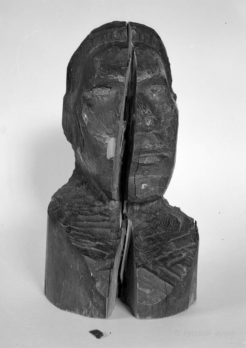 Общее загрязнение поверхности скульптуры. Крупная, расширяющаяся книзу трещина уходящая «клином» в основу на глубину до 10 см, проходит по лицевой части головы от темени до основания скульптуры. Подвижные отщепы древесины по краям трещины (справа). Длинная, тонкая трещина на лицевой поверхности от подбородка до основания носа (слева). Крупная утрата основы на левой щеке. Потертости красочного слоя на рельефных деталях головы и по авторской фактуре. Деструкция древесины на тыльной поверхности скульптуры.