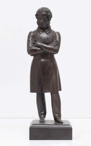 Среди первых посмертных изображений поэта были бюст и статуэтка, выполненные в 1837 году А. И. Теребеневым. До наших дней сохранилась небольшая восковая фигурка, тиражировавшаяся в разных материалах: гипсе, дереве, бронзе, чугуне, бисквите. 23-летний скульптор имел возможность не раз видеть Пушкина в книжной лавке своего отчима И. В. Слёнина. Опираясь на личные впечатления, он создал глубоко лирический, камерный образ. Е. В. Карпова // «Он победил и время и пространство...». К 225-летию со дня рождения А. С. Пушкина. СПб, 2024. С. 55.