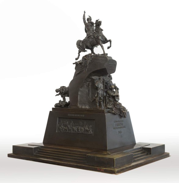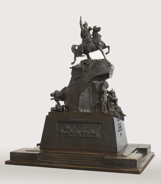 Это описание вполне соответствует хранящейся в Русском музее бронзовой модели, за исключением двух утраченных фигур «белорусса» и «червонорусса» 4. О том, как они выглядели, можно судить по модели памятника Богдану Хмельницкому, принадлежащей Национальному художественному музею республики Беларусь. В отличие от экспоната ГРМ минский экземпляр не имеет барельефов на пьедестале 5.