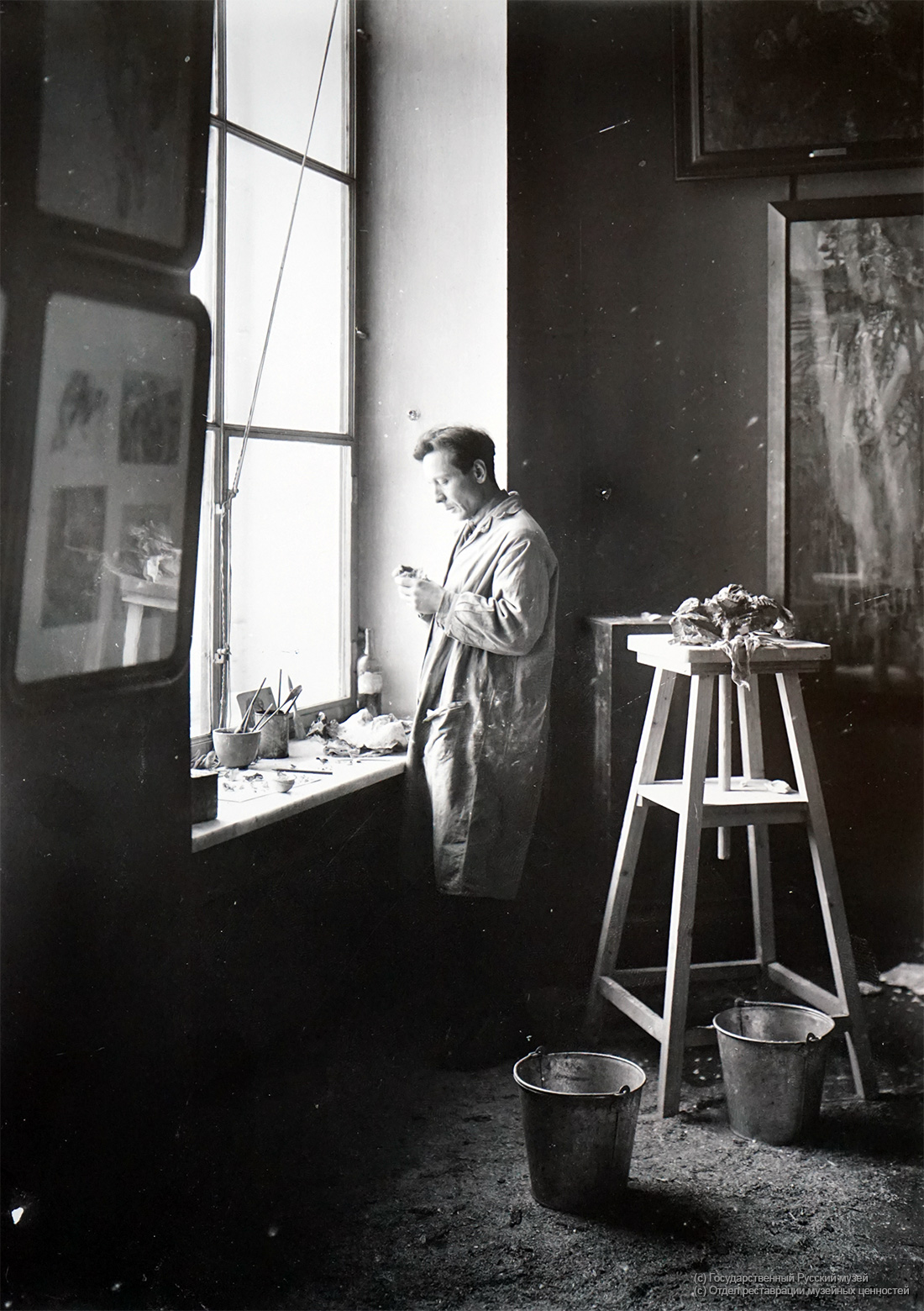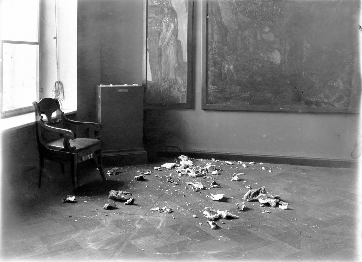В конце декабря 1928 года душевнобольной посетитель Русского музея сбросил с постамента гипсовую скульптуру работы М. А. Врубеля. Экспонат упал на пол и раскололся на множество фрагментов. 2 января 1929 года состоялось заседание Реставрационной комиссии, где было принято решение о немедленной реставрации скульптуры на месте, так как перемещение фрагментов в другое помещение могло привести к утрате некоторых деталей.