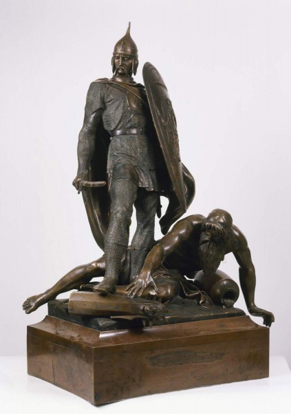 Композиция «Торжество христианства или Ниспровержение идолов», символизировавшая город «Киев», была единственной переведенной в бронзу. Ранний отлив экспонировался в 1862 году на Всемирной выставке в Лондоне, где привлек внимание знатоков искусства не только высоким техническим исполнением бронзового литья, но и своим сюжетом. В этой группе Пименовым был представлен важнейший эпизод в истории Государства Российского — введение христианства. Фигура воина, держащего щит и меч, изображает святого равноапостольного князя Владимира, который попирает языческого идола Перуна. На щите — изображение архангела Михаила с горящим мечом в руке. У ног князя Владимира — сосуд с надписью «Днепр», аллегорически поясняющий, что крещение русского народа происходило в Киеве. Ольга Кривдина // Забытая Россия. Проекты памятников и монументальная скульптура XVIII — начала XX века. СПб, 2006. С. 29.