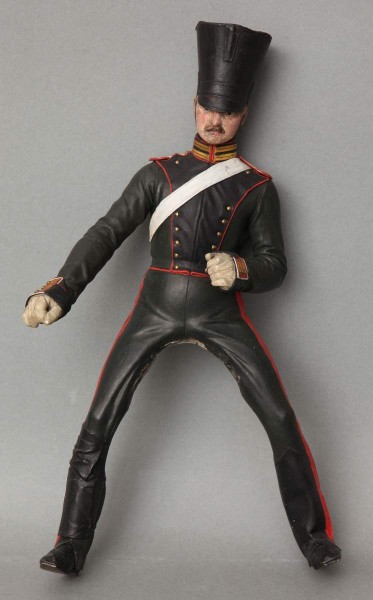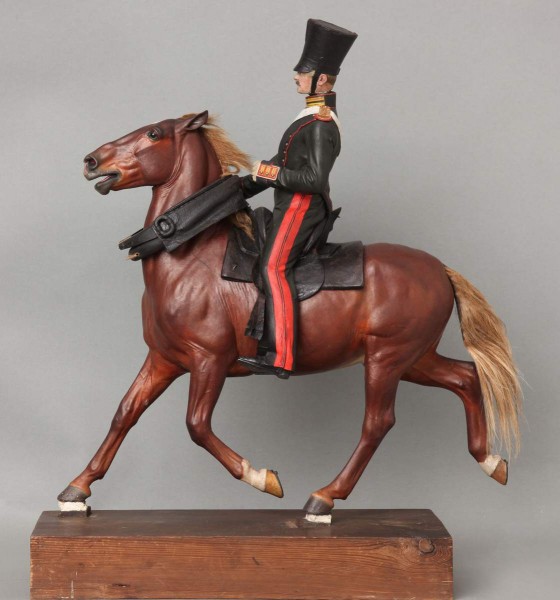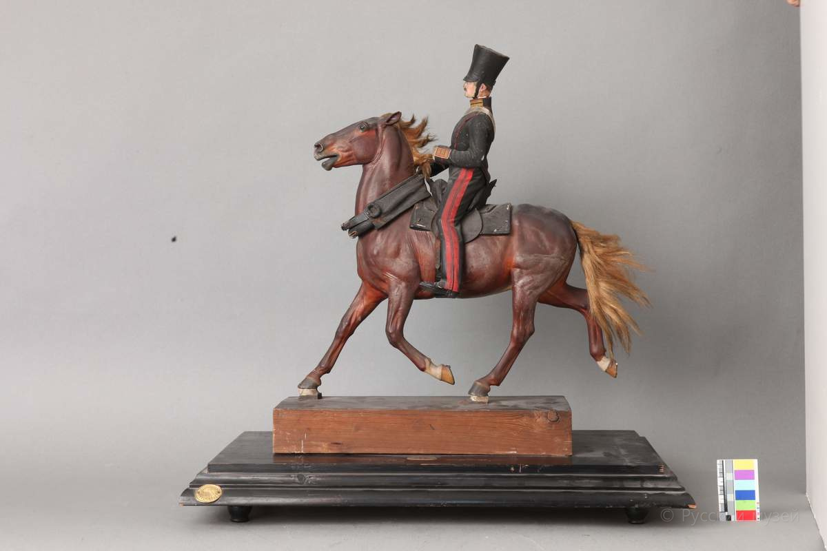 Скульптурная композиция изготовлена из разных материалов. Фигура коня, седло и фигура артиллериста отлиты из гипса и раскрашены масляной краской. До поступления в ГРМ фигуры были поновлены черной гуашью. На фигуре коня были утрачены кончики ушей и элементы подков. Грива и хвост коня, выполненные из льняного волоса, были загрязнены. Элементы кавалерийского седла и хомут, изготовленные из кожи, поновлены гуашью. Кожа пересохла, потрескалась и частично была утрачена. Голова наездника, выполненная из воска, расписана масляными красками и поновлена до поступления в Русский музей. Имелись утраты красочного слоя. На фигуре артиллериста наблюдались утраты гипса. На деревянном основании трещины. Вся композиция была загрязнена атмосферной копотью. Утрачены элементы обмундирования артиллериста: эполеты, пуговицы, сабля, подбородочная чешуя на кивере. Утрачены части упряжи коня: стремена и шпоры.