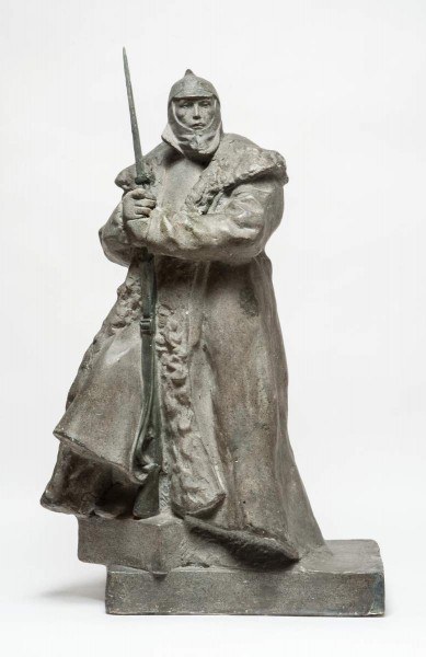 Судя по станковым композициям, на рубеже 1920–1930-х Шервуду было важно перейти от исторического портрета к композиции на актуальную политическую тему. Именно на этом поприще его ожидал успех, вписавший его в историю советского искусства не только как создателя первого советского памятника, но и как автора образцового скомпонованного портрета-типа. Шервуд получил заказ Реввоенсовета на исполнение композиции для выставки «XV лет РККА». После некоторых поисков подходящей темы скульптор выбрал «Часового» («на страже», «на посту»), который стал главным экспонатом выставки и был установлен перед входом на экспозицию в Москве. Изображение фигуры было напечатано на обложке каталога ленинградской выставки. Успех скульптуры обусловлен не только мастерским изображением воина на страже социалистической стройки, но и точным соответствием духу времени, когда СССР все более превращался в осажденную крепость, окруженную врагами. В этой композиции сказалось обращение Шервуда к конструктивистскому построению фигуры из геометрических форм. В то же время скульптор не отступал и от своих импрессионистических убеждений: работая в гипсе, Шервуд представлял свою работу в камне, поэтому набросал на поверхность «искрящиеся блестки», не только придавшие гипсу вид камня, но и передававшие впечатление морозной погоды. Не было забыто и увлечение передачей разных цветов при помощи разных материалов: винтовку Шервуд предполагал выполнить из стали, и только технические трудности помешали это сделать в экземпляре для выставки (в крупноформатном и в станковом варианте штык и приклад были выкрашены в черный цвет). Образ «Часового» использовался в массовой агитации. «Часовой» был признан «одним из первых произведений социалистического реализма в скульптуре», а его автор на 62-м году жизни стал живым классиком. Павел Бельский. Творчество Леонида Шервуда после октября 1917 года // Скульптор Леонид Шервуд… СПб. 2023. С. 17.