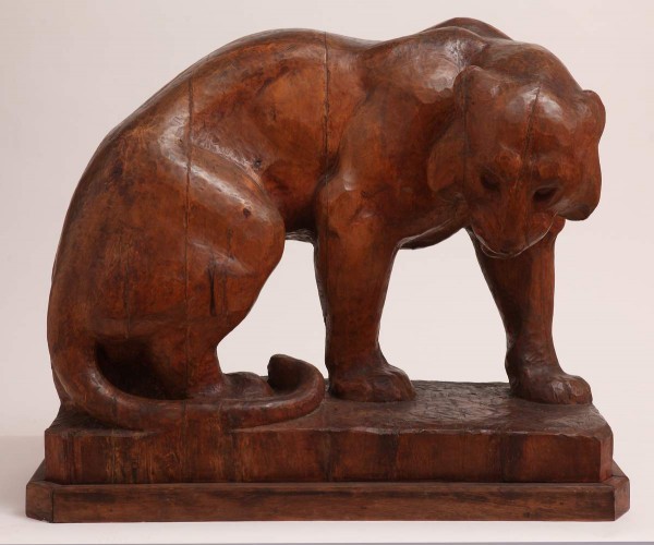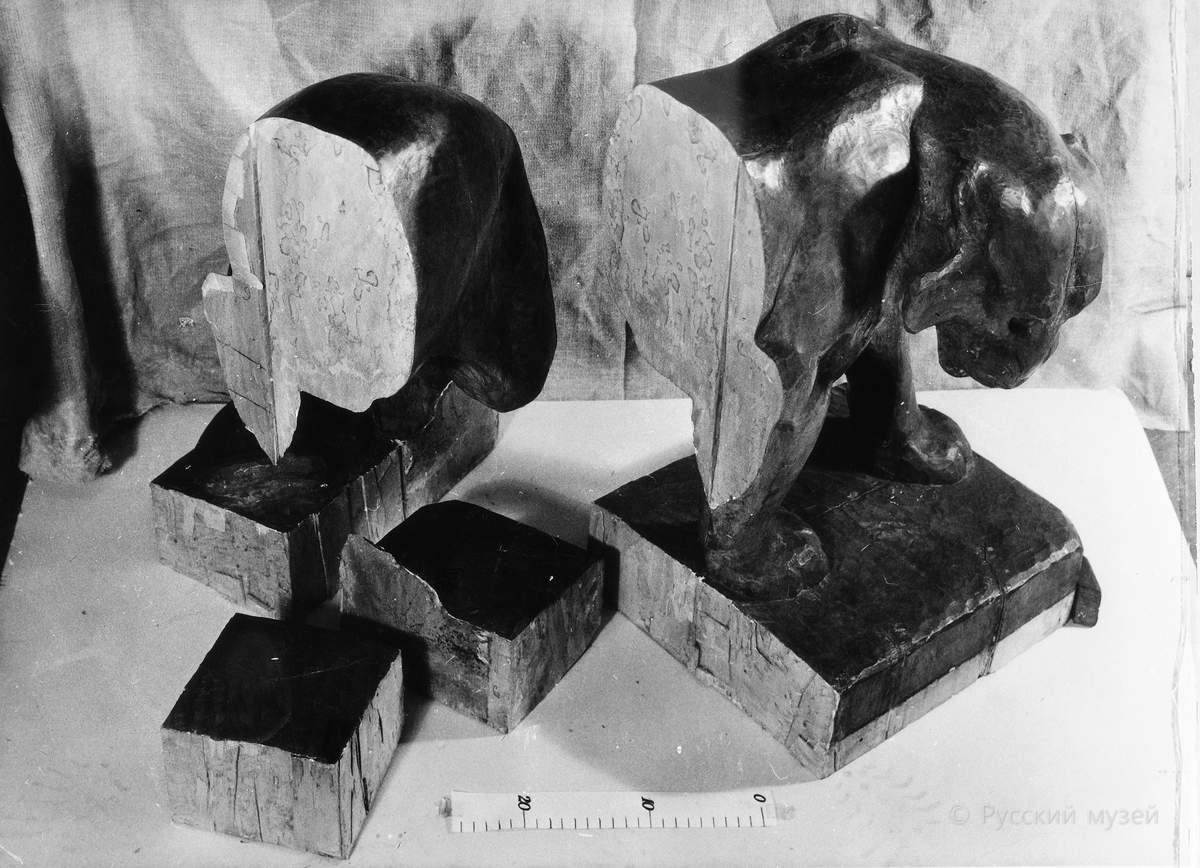 Скульптура расколота на 2 части по клеевому шву; постамент расколот на 4 части по клеевым швам; рейки, скрепляющие постамент, оторваны от основания; часть рейки в правом углу основания – утрачена; разрыв древесины со сдвигом на передней левой лапе; жесткий отщеп на задней левой лапе; многочисленные вертикальные трещины по всей поверхности скульптуры и постамента; сильное загрязнение поверхности.