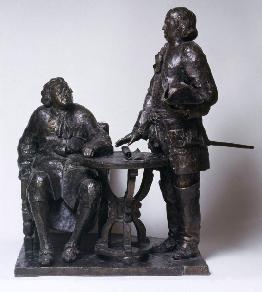 В обширной сфере интересов Петра Великого не последнее место занимало изучение географии России и близлежащих территорий. Перед самой смертью он дал указание об отправке экспедиции на Дальний Восток, во главе которой поставил Витуса Беринга (1681– 1741). Датчанин по происхождению, Беринг участвовал в Северной войне и войне с Турцией, был капитаном-командором русского флота. Он руководил первой (1725–1730) и второй (1733–1741) Камчатскими экспедициями, во время которых обнаружил пролив между Чукоткой и Аляской, достиг Северной Америки и открыл ряд островов Алеутской гряды. В его честь названы пролив, море и Командорские острова. Семынин в своей композиции увековечил момент получения Берингом секретных инструкций от царя, в которых предписывалось отыскать перешеек или пролив между Азией и Северной Америкой. Скульптор не идеализирует внешность Петра, уже находящегося в конце жизненного пути, а, наоборот, подчеркивает в его сидящей сутуловатой фигуре утомление и противопоставляет ей бодрый, энергичный образ стоящего «морского волка» Беринга. Марина Стекольникова // Электронный каталог «Герои и злодеи русской истории». СПб, 2010. С. 198.