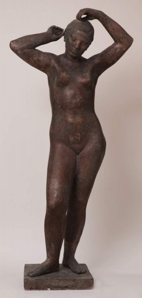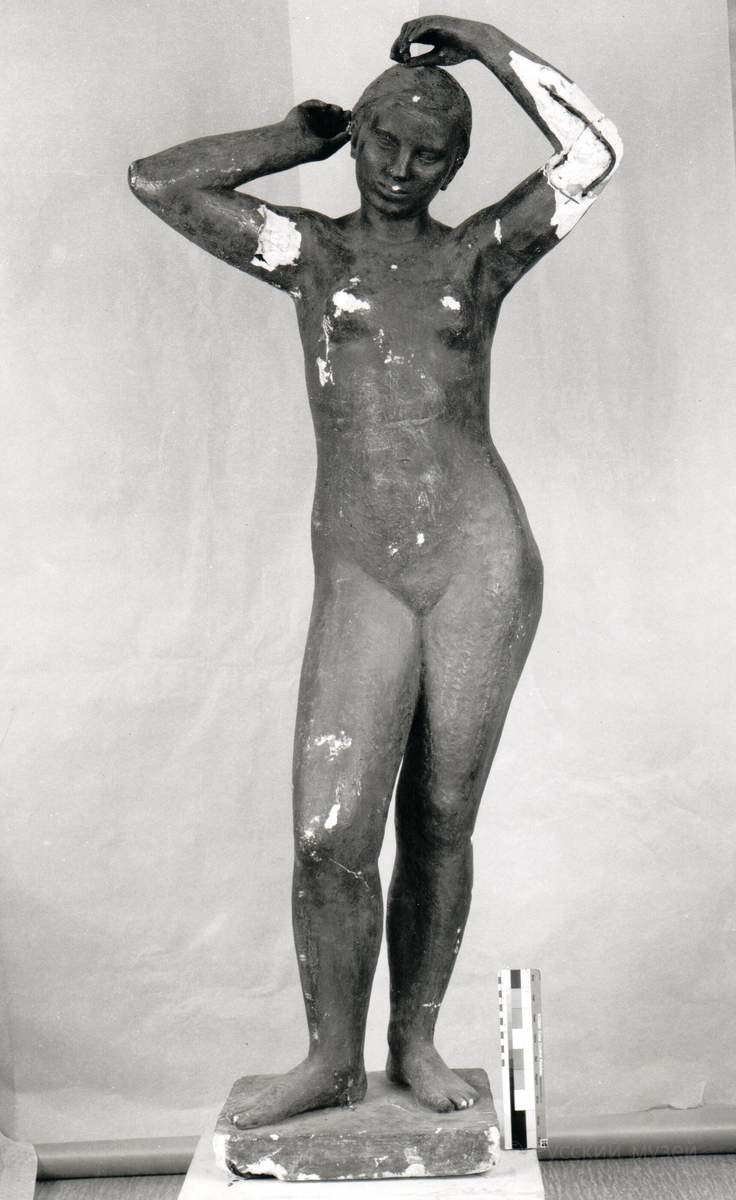 При поступлении в реставрацию скульптура имела значительное пылевое загрязнение, потертости, царапины. Были утрачены части рук, фрагмент косички, углы основания, имелись сколы на груди, на правом боку, внизу живота, на ногах, многочисленные мелкие сколы по всей поверхности. В местах утрат фрагментов рук проходили сквозные трещины с оголенным корродированным каркасом, осыпями и отслоениями гипса. От основания вверх по ногам образовались многочисленные сквозные трещины с раскрытием.