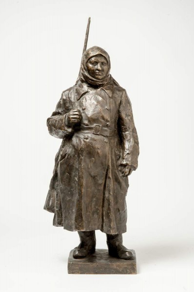Изображена Мария Ивановна Еремичева (?–?) — охранница Судостроительного завода им. А. А. Жданова (ныне — «Северная верфь»). Картины военной жизни в отечественном искусстве XVI–XX веков. СПб, 2022. С. 166.